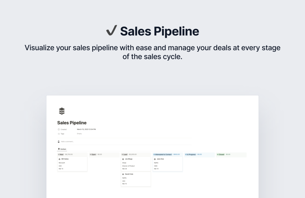 • Visualize your sales pipeline with ease and manage your deals at every stage of the sales cycle.