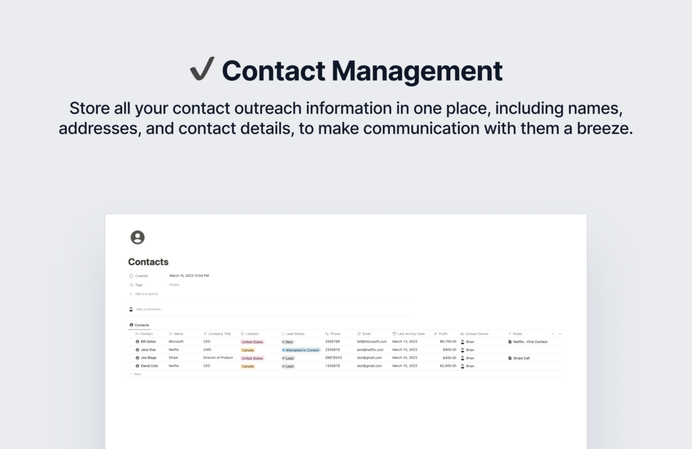 - Store all your contact outreach information in one place, including names, addresses, and contact details, to make communication with them a breeze.