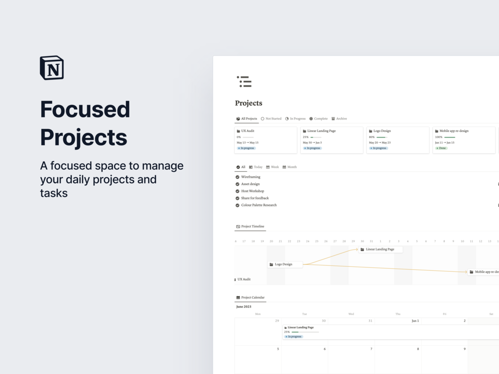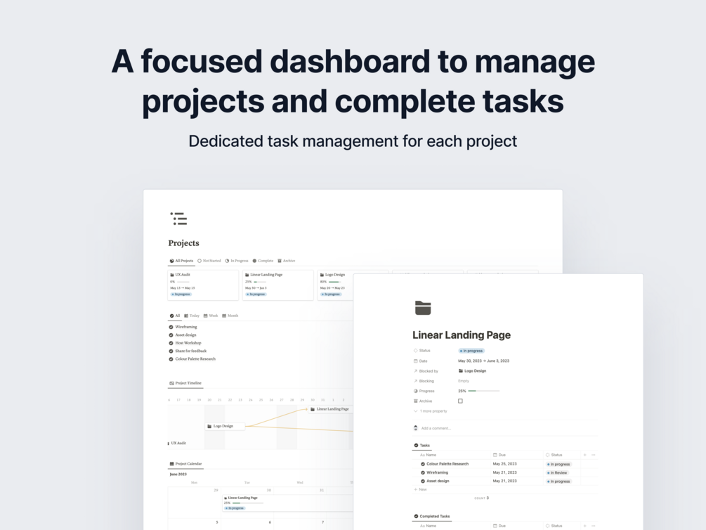 Projects and Tasks is a project management and task management template combined in a single focused dashboard.