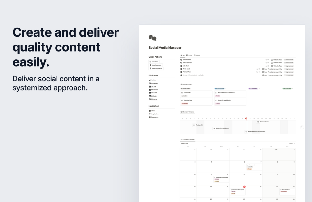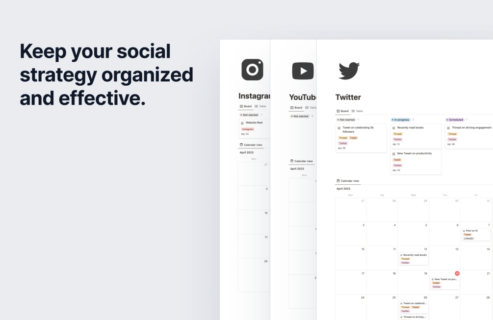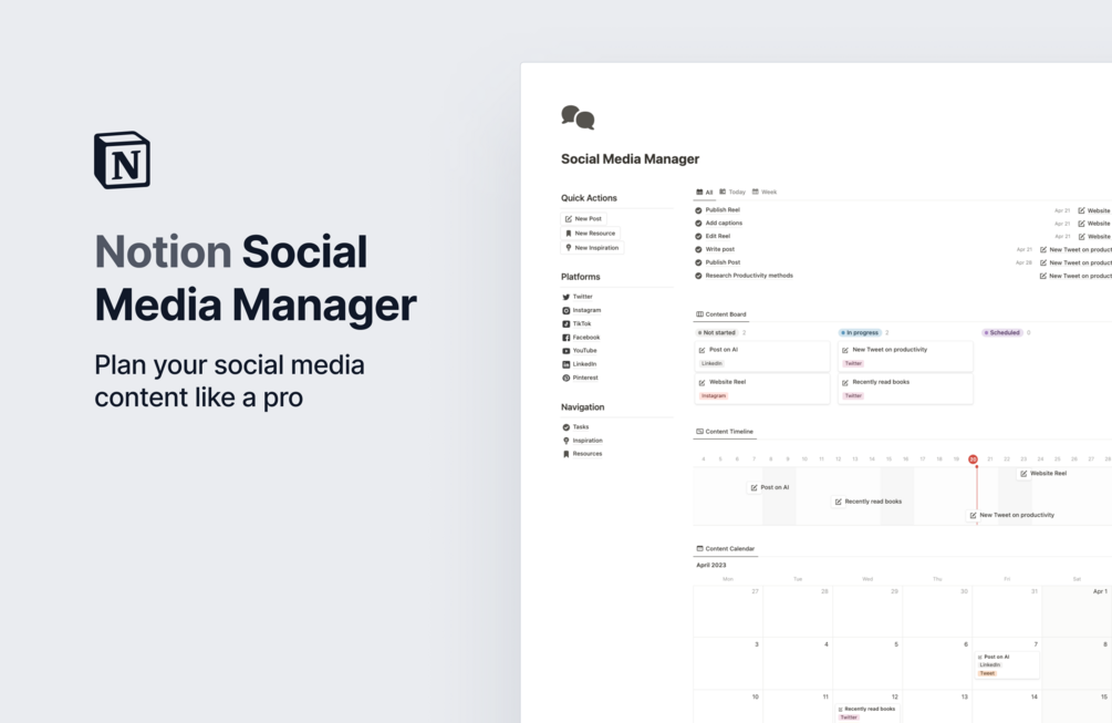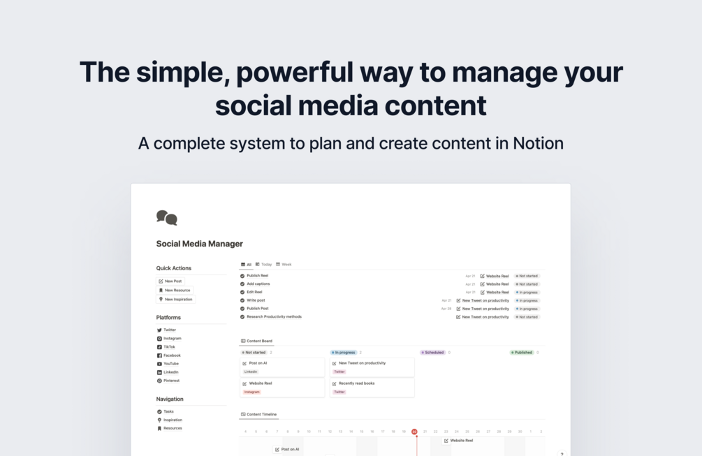 Notion Social Media Manager is a complete system to plan and create social content in Notion. Designed to let you easily manage your social posts, tasks, goals & content. All in one place.
