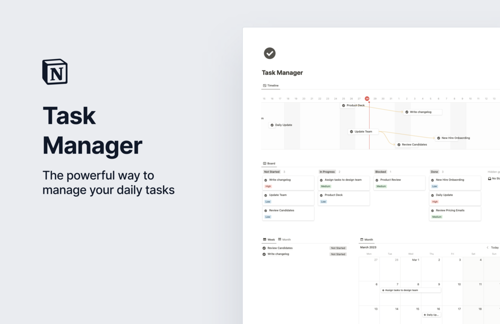 Notion Task Manager allows you to effortlessly create tasks, track progress & assign dependencies.