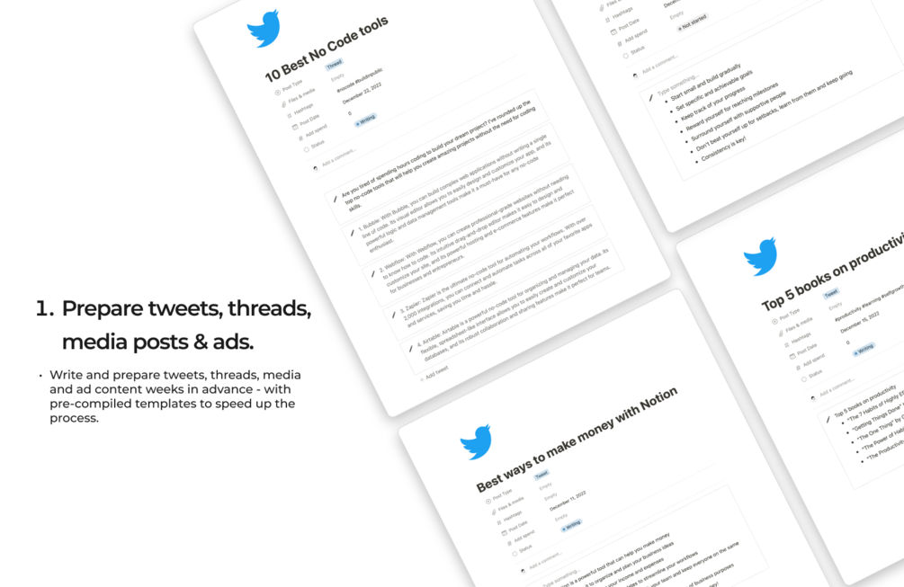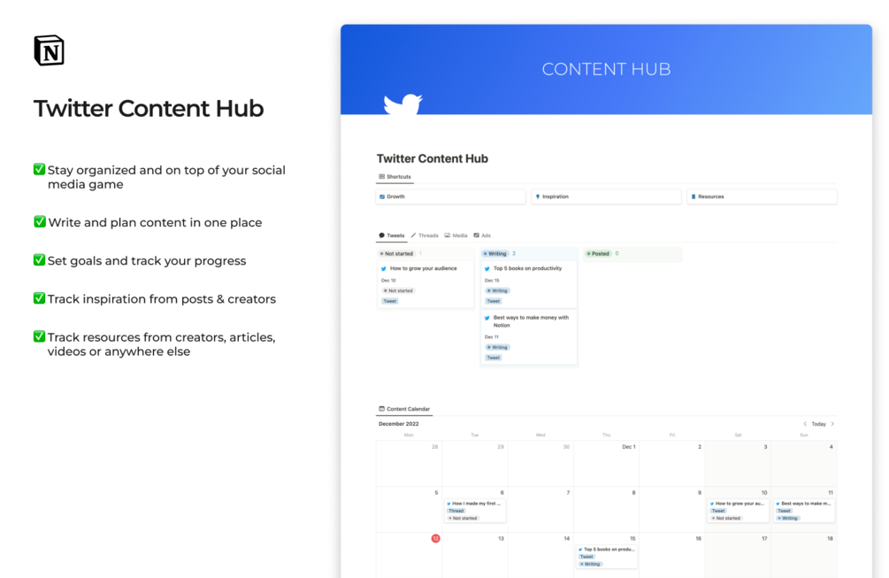 With the Twitter Content Hub Notion template, you can take control of your social media growth and elevate your brand's online presence. Say goodbye to random, unplanned content and hello to a more organized and effective Twitter strategy.